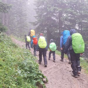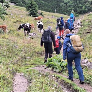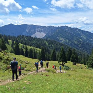 Die Vorbereitung zu unserer Tour im begann im Herbst 2024: Mit acht Familien haben wir uns im Up! DAV Kletterzentrum getroffen. Die Interessen sind relativ breit, einige trauen sich alpine Übergänge zu, viele Anwesende haben jedoch noch keine Hüttenerfahrung. Daher fokussiere ich mich auf ein Angebot, das auch Einsteiger:innen mitnehmen soll. Die Wahl fällt schlussendlich auf eine Route, die ähnlich in einem Wanderführer für Familien (als Hüttentour) und für Erwachsene (als Tagestour für Wahnsinnige) steht. Als Mehrtagestour bleibt reichlich Gelegenheit für Abstecher und Umwege und selbst bei langen Gewittern sollte sich ein Zeitfenster für den direkten Übergang finden. Vieles kann, wenig muss.