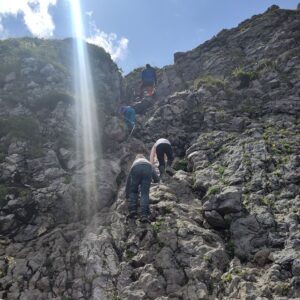 Tag 4: Nach nächtlichem Gewitter steht heute der Übergang zum Rotwandhaus an. Zum Glück hält der Regen nicht lange an und beschert uns einen Vormittag in den Wolken. Da der Boden noch sehr nass ist, freuen wir uns über die Flexibilität und nehmen den direkten Weg. Als wir am Rotwandhaus ankommen, verlassen gerade die letzten Übernachtungsgäste die Hütte. Der Nachmittag bleibt trocken und ein Teil von uns erkundet die umliegenden Gipfel.
