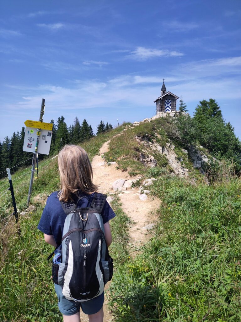 Tag 3: In Luftlinie ist der heutige Übergang zur Maxlrainer Alm ein Spazierweg. Wir laufen jedoch zunächst in die Gegenrichtung und halten uns die Option offen, je nach Wetter alle Gipfel in Reichweite mitzunehmen – oder es bei einer Höhenwanderung auf Passhöhe zu belassen. Den ersten Abstecher – zum Aiplspitz – nimmt nur die Hälfte von uns in Angriff. Als es an einem schwierigen Wegabschnitt zu tröpfeln beginnt, brechen wir ab. Bei Regen möchte ich diesen Weg nicht zurück müssen – zumal nicht mit Kind. Wir treffen uns an der Schnittlauchmoosalm und wenig später ist es bereits wieder trocken. Zusammen entscheiden wir uns zu einer gemeinsamen Überschreitung des Raukopfs. In Gipfelnähe ist dann zum ersten Mal von allen Trittsicherheit gefragt. Nach einer anschließenden Pause am Taubensteinhaus machen einige von uns noch den kurzen Abstecher zum Taubenstein. Der erfordert etwas Kletterei in einer Rinne, ist aber auch für die Kinder gut zu schaffen. Am Abend steigen wir zur direkt unterhalb des Gipfels gelegenen Maxlrainer Alm ab. Die Privathütte entpuppt sich leider als Dauerbaustelle. Glücklicherweise schafft es der Koch in nächtlicher Abwesenheit des Wirts den Laden halbwegs zusammen zu halten.