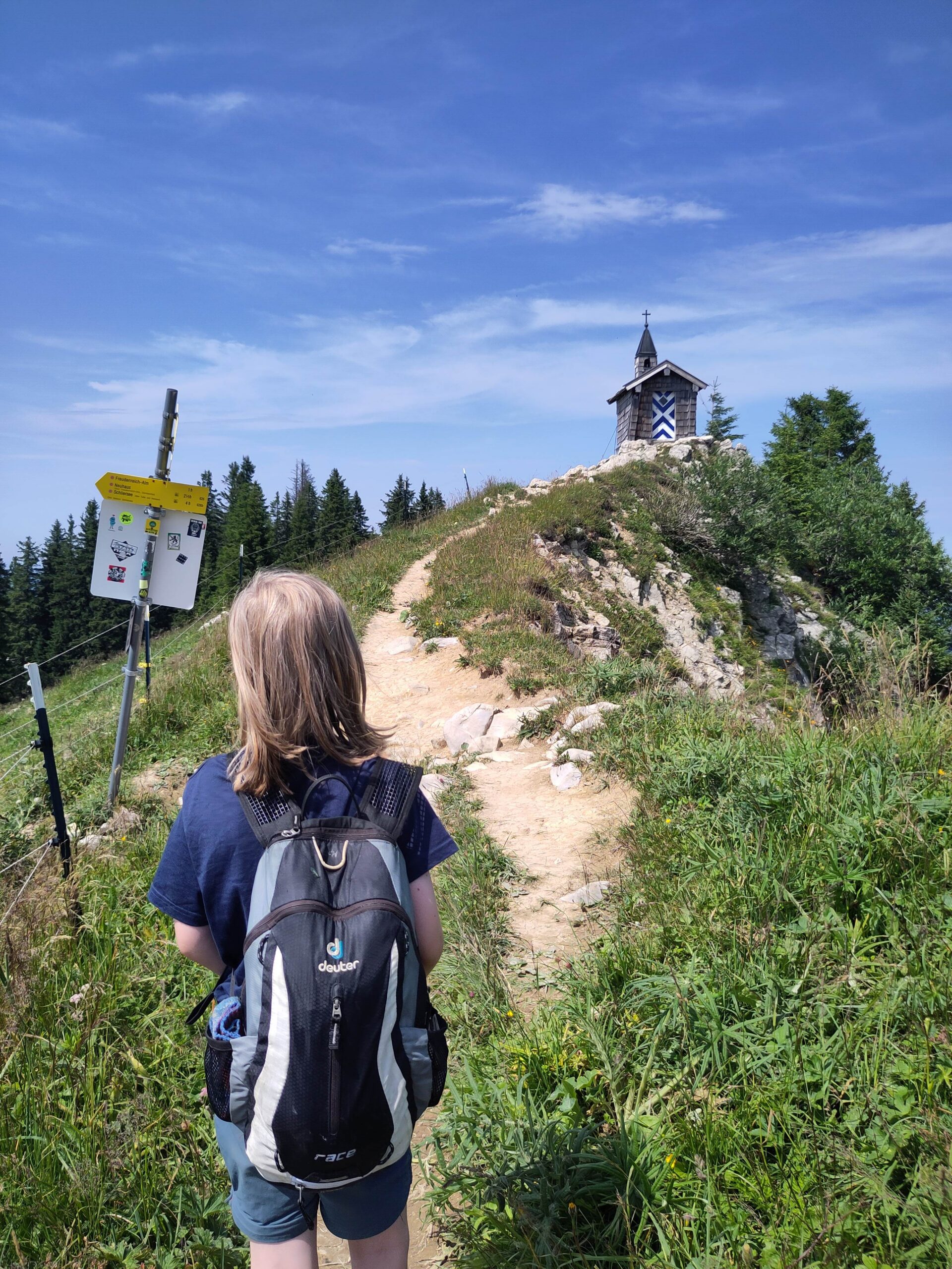 Tag 6: Der Gegenanstieg zum Bodenschneidhaus führt durch eines von Deutschlands wichtigsten Skigebieten. Anstatt unterhalb des Sessellifts in der stechenden Sonne zu schwitzen, entschließen wir uns für eine Fahrt. Es ist der heißeste Tag der Woche und die Höhe bietet hier keine ausreichende Abkühlung. So freuen wir uns beim Verlassen der Piste, dass wir uns noch unterhalb der Baumgrenze befinden. Nach einer Stärkung auf den Firstalmen teilen wir uns auf: Andreas, eines der Kinder und ich hoffen auf einen erfrischenden Wind am Grat und wagen einen Abstecher in Richtung Brecherspitze. Einige Leute, die uns von dort entgegenkommen, bezeichnen den Gipfel als Backofen und so drehen wir ab. Nahe der Freudenreichalm treffen wir den Rest der Gruppe. Weiter geht es im angenehm kühlen Bergwald und schon bald sind wir am Bodenschneidhaus.